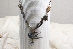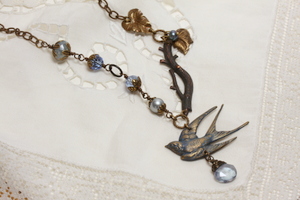 An asymmetrical style inspired by swallows taking flight. Crafted with American made brass from Vintaj and Trinity Brass this necklace also features two freshwater pearls, a blue quartz briolette and Austrian crystals. A few leaf charms have been added right above the branch. Eclectic and so easy to wear.