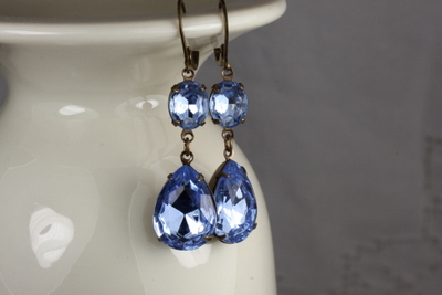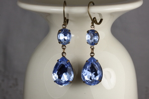 Created with small oval and pear shaped vintage rhinestones these light sapphire blue earrings are perfect for many occasions. Hand set in brass pronged settings the earrings measure 2 1/8 inches from the top of the ear wires to the bottom of the pear rhinestones. All metals are brass which was manufactured, oxidized and sealed in the United States.
