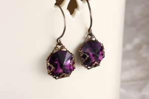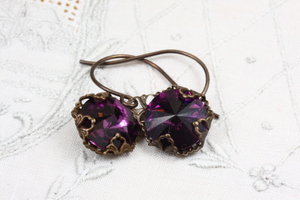 These earrings are in a style everyone can wear, universally flattering! Created with Swarovski rivolis and Vintaj Brass filibree they are featured in a rich amethyst. Earrings measure1 1/8 each from the top of the ear wires to the bottom of the filigree wrapped rivolis. All meatls are American made Vintaj Brass.