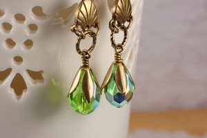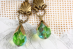 These earrings were created with vintage Czech peridot green glass teardrop beads. One side has a lovely ab shine to it which reflects blues, greens and adds plenty of movement and sparkle. Each drop has been embellished with brass beadcaps. They are suspended from Art Deco connectors and etched jumprings. The earrings measure 2 1/4 inches from the top curve of the lever backs. All metal is oxidized, sealed brass made in the United States.