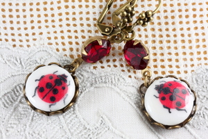 These earrings were created with vintage ladybug cameo/cabochons and vintage Swarovski red rhinestones. The earrings measure 1 3/4 inches from the top of the brass lever back earrings to the bottom of the ladybug cameos/cabochons. All brass was manufactured in the USA.