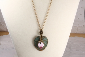 The lily pad is solid American made brass that has had a verdigris finish applied to it. The lovely lotus is actually a vintage pink and white glass bead that has been embellished with a Swarovski pink crystal and an American made bright brass bead cap. The chain is solid brass which has a slight patina and measures 22 inches. The pendant and bail measure 1 x 1 3/4 inches. All brass is American made.