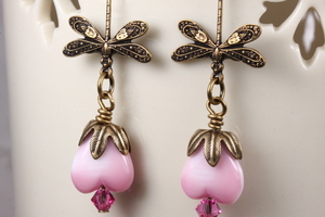 Created with antique gold finished bright brass dragonflies Each one carries a vintage pink and white beads embellished with bead caps in the same golden brass tone of the dragonflies and a light rose Swarovski bead. The length of the earrings from the tops of the ear wire curves to the bottom of the pink crystal is 1 5/8 inches. All metals are American made Triinity Brass.
