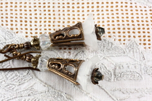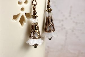 The winter white lucite flower has been embellished with a sheath of brass filigree and two beads on the very top. Between the brass beads and lucite flower is a clear glass flower bead. Inside the flower is glass baby bell flower, a small brass bead cap and Czech crystal. The earrings measure 1 7/8 inches from the tops of the ear wires to the bottom of the crystals. All metals are American made Vintaj Brass and the glass beads were made in the Czech Republic.
