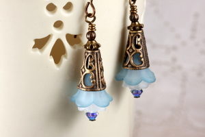 The blue lucite flower has been embellished with a sheath of brass filigree and two beads on the very top. Inside the blue flower is another lucite lily flower, glass baby bell bead and blue crystal. The earrings measure 1 7/8 inches from the tops of the ear wires to the bottom of the crystals. All metals are American made Vintaj Brass and the glass beads were made in the Czech Republic.