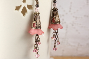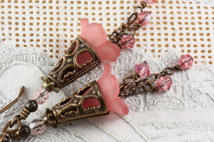 The lucite flower is tucked into a brass filigree and further topped with two brass beads and one rosaline peach fire polished bead. Suspended from each flower are three lengths of delicate chain finished with peach crystals. From the top of the ear wires to the bottom of the lowest crystal each earring measures 2 1/2 inches. All metals are American made Vintaj Brass. The beads were made in the Czech Republic. Please Note! These earrings are more of a peach/coral color than pink.