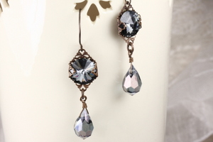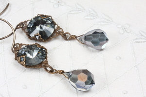 The crystal teardrop is Premium Preciosa and the rivolis is Swarovski, both known for their high quality and durability. The rivoli has been encased in a Vintaj Brass filigree piece and the tear drop crystal has been wire wrapped . Together they make elegant earrings. These measure 2 inches from the tops of the ear wires to the bottoms of the tear drops. All metals are American Vintaj Brass.