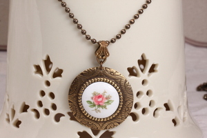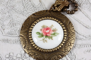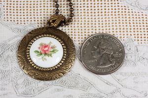 A lovely vintage Japanese decal rose cabochon really needs no embellishment. The setting measures 1 1/4 inches. The back edges are thick brass, but hollow, With the small bail the pendant drop is 1 1/2 inches.The pendant is suspended from a ball chain that closes with a lobster clasp. All metals are American made Vintaj Brass, The cameo is vintage Japanese glass. The chain meausres 18 inches but you may request a different length at no additional cost.