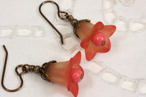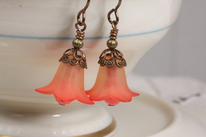 The lucite flowers were hand colored and if you look closely you will see they are a very soft coral/ yellow near top and a deeper coral at the bottom. They have been embellished with a coral colored teardrop beads peeking out from under the petals. The tops of each earring are finished with two types of bead caps, one a simple filigree, the other an open style. A brass bead tops off each earring. Each earring measures 1 1/2 inches from the top of the ear wire to the bottom of the bead. All metal parts are brass and were manufactured in the USA by Vintaj Brass.