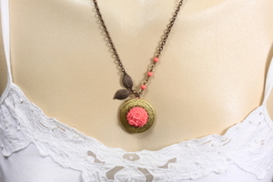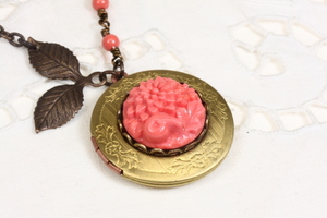 This locket combines the new with the not so new and creates a study in contrasts. The gold colored brass etched locket is embellished with a vintage Japanese glass "carved" coral glass cabochon. The cabochon has been mounted and secured in the center of the locket. Hand wrapped glass pearls and a Vintaj double leaf charm form two different sides of the Vintaj brass chain. The necklace measures 19 inches and the diameter of the locket is about 1 1/4 inches. All Vintaj brass was made in the USA. The Japanese cabochon was made in the 1950's.