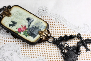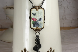 Such a wonderful shabby French style necklace. The decoupage tile is securely wrapped in a Vintaj Brass Art Deco piece and embellished with Vintaj Arte Metal charms, a bird, leaf and daisy. The chain is also black Arte Metal with a a subtle embellishment of small glass beads. The chain measures 22 inches, the pendant section is 1 1/2 inches and the charm section is also 1 1/2 inches. Finished with an Arte Metal hook clasp. Vintaj Arte Metal is manufactured in the United States and is nickle-free.