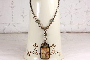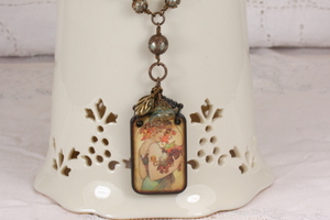 A beautiful, unusual necklace pendant featuring a decoupage Mucha image. The pendant hangs from an embellished Vintaj Brass chain. Near the pendant are five Swarovski pearls in a soft neutral green. Each one is encased with a Vintaj Brass bead cap and linked with etched rings, also from Vintaj. Above the pendant are two glass beads, a flower and vintage leaf, The pendant is attached to the chain with a lovely black brass connector from Fallen Angel Brass. The chain measures 18 1/2 inches, the pendant and the pearl drop section measures 3 inches. Finished with a Vintaj Brass hook clasp. All brass was made in the USA.