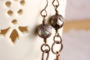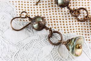 Each earring features an irridesent transparent soft green flower bead and a Swarovski soft green pearl. Embellished with Vintaj Brass bead caps, the beads are linked together with etched Vintaj Brass links. A Vintaj Brass ear wire completes each earring. The earrings measures 2 inches from the curve of the ear wire to the bottom of the flower bead. All brass wass manufactured in the United States.