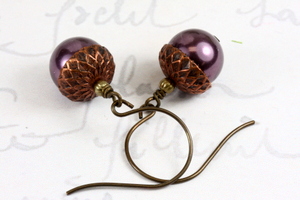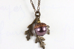 Simple. Casual. Weekend perfect. Acorns were created with 12mm Swarovski burgundy glass pearls and American made Vintaj copper bead caps. The necklace features a curved oak leaf which measures 1 1/2 by 1 1/4 inches at the widest points. The figaro chain measures 19 inches. The earrings are 1 3/8 inches from the top of the ear wires to the bottom of the pearls. All brass is American manufactured Vintaj Brass.