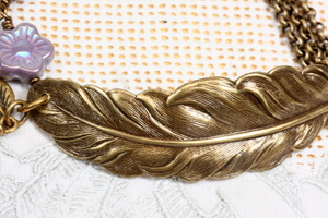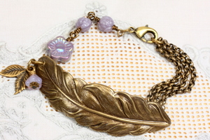 Crafted with a highly detailed American made brass feather as its base, the bracelet has been finished with Czech glass flower beads in subtle shades of lavender, three lengths of rolo chain and a sweet leaf and flower charm. The bracelet measures 7 inches, but an extender can be added. All metals are American made brass.