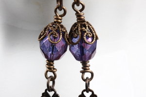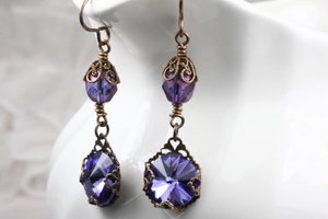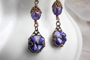 These earrings feature Swarovski tanzanite rivolis and premium Preciosa Czech glass beads. Each rivoli is framed in filigree and the glass beads topped with filigree bead caps. The earrings measure just under 2 inches from the tops of the ear wires to the bottom of the rivolis. All metals are American made Vintaj Brass.