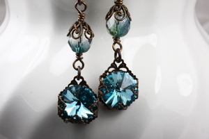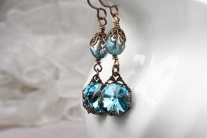 Made with beautiful turquoise Swarovski rivolis wrapped in brass filigree, these earrings combine energy and style. The premium Preciosa Czech glass beads are embellished with filigree bead caps. The earrings measure 1 3/4 inches from the tops of the ear wires to the bottoms of the rivolis. All metals are American made Vintaj Brass.