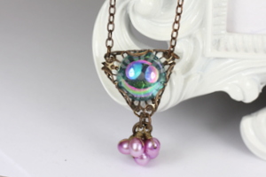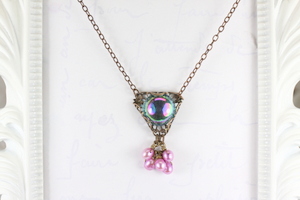 The glass stone is a vintage Czech piece and has been enveloped in vintage brass filigree. Although the predominant color of the stone is aqua there is a lively pink shine that bounces off of it. There are five lustrous freshwater pearls that comprise the dangle below the stone. Simple, colorful and versatile. The chain measures 18 inches the stone and dangle is 1 3/4 inches. All brass was manufactured in the USA. American manufactured Vintaj brass chain.