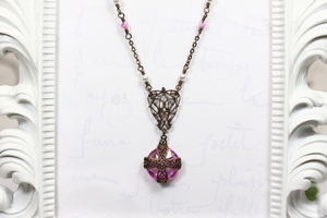 The deep pink glass jewel has been wrapped in a sturdy brass filigree and is suspended from anothe brass filigree piece. The chain has been hand beaded with Swarovski white pearls and givre fire polished beads. A lovely piece for any occassion. The chain measures 18 inches and the filigree piece with glass jewel measures 2 inches. All brass is American made Vintaj Brass.