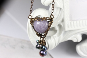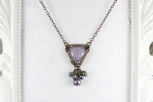 A very subtle lavender the glass stone is encased in vintage brass filigree. The freshwater pearls add luster in varying shades of blue and grey. The chain measures 18 inches, the stone and cluster is 2 inches long. All metal is American made brass.