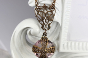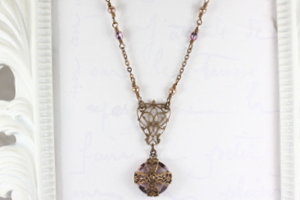 Although the glass stone is a subtle light amethyst the necklace is a very neutral piece. The stone is encased in filigree and is suspended from aother filigree piece. The chain is embellished with Swarovski bronze glass pearls and Czech glass beads. The chain measures 20 inches, the stone and filigree is 1 3/4 inches. All brass is American made Vintaj Brass.