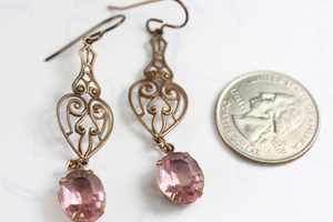 These earrings were created with a open filigree drop formed in the shape of a heart. Each one is embellished with a vintage, soft pink glass jewel. These have been set in open back brass prong settings. They are about 2 3/4 inches long from the top of the ear wires to the bottom of the glass jewels. American made Vintaj Brass and Czech glass stones.