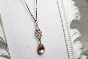 The filigree which takes the form of a streamlined heart sets off the vintage glass rhinestone which is secured in a brass prong setting. The chain measures 20 inches and the pendant is 2 1/2 inches long. Finished with a small hook clasp. All brass is American made Vintaj Brass. Czech glass jewel.