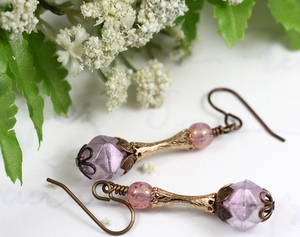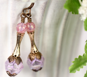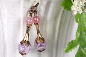 Simple earrings created with Czech made, English rough cut, glass beads, smooth pink/lavender beads and vintage gilt connector beads. The bottom beads are embellished with two styles of bead caps. Earrings measure about 1 1/2 inches long. All brass is American made Vintaj Brass.