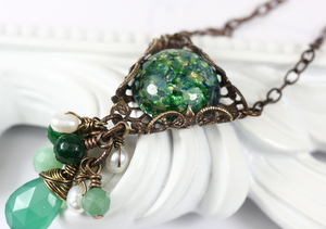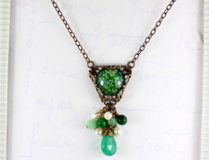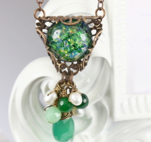 Created with a vintage glass opal in vibrant shades of green, a spark og gold and black. Encased in a vintage brass filigree the pendant is embellished with a cluster of jade beads, freshwater pearls and green onyx gemstone briolette. The chain is 18 inches long and the glass opal with cluster measures 2 inches. All brass was made in the United States. The chain and clasp are American made Vintaj Brass