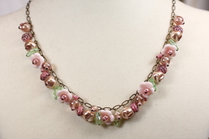 The pink blossoms of this necklace are vintage German made glass flower beads from the 1950's. The centers of the blooms are also vintage Czech glass beads. Along the partially embellished chain are Czech glass baroque pearls, Czech glass luster beads, Czech green glass leaves and Czech glass ladybug beads. The length of the necklace is 17 1/2 inches. Finished with a brass vintage clasp. All metals are American made antique brass plated brass.