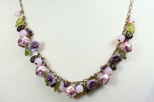 Created with shades of purple, lavender and mauve the necklace features vintage aand contemporary beads. The four vintage lavender flower beads add a nice balance to the iced light purple baroque glass pearls and pink/light purple smooth beads. There are a few dark amethyst ladybug beads scattered throughout the necklace, too. Accented with tiny Swarovski blackberry glass pearls the necklace measures 18 inches. Finished with a vintage, brass spring ring clasp. Al metals are American made brass.