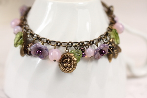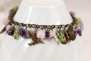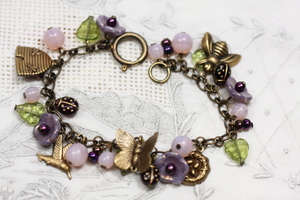 Sweet vintage style bracelet features four vintage lavender glass flower beads, contemporary Czech glass beads and five, light weight oxidized brass charms. You'll find a bee, a beehive, a small nest, a hummingbird and a butterfly. embellished with Swarovski blackberry glass pearls and deep amethyst ladybug beads the bracelet measures 7 3/4 inches. Finished with a spring ring clasp. The chain is American made brass.