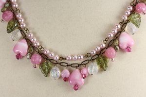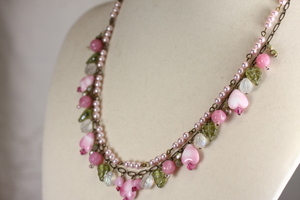 The pink flower beads in this necklace are really vintage German glass heart beads. Each one is a little different from all the others. To create this necklace Czech beads such as opaque pink melon beads, glistening white lady bug beads and green leaf beads were added to the mix. Inner necklace was created with Preciosa glass pearls in a lovely soft pink. The necklace measures 18 inches. All metals are American made brass.