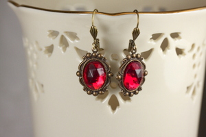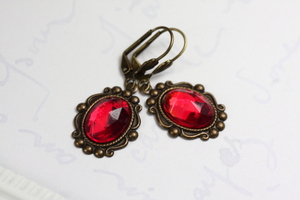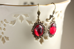 These were created with vintage red glass cabochons and contemporary brass settings. The earrings are a vibrant red and measure 1 1/2 inches from the tops of the lever backs to the bottoms of the settings. All metals are American made brass.